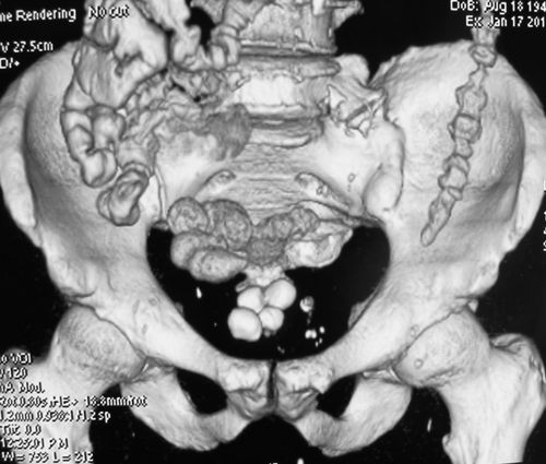 Рецидив рака шейки матки с формированием комбинированного мочепузырно-влагалищно-прямокишечно-тонкокишечного свища