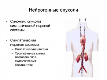Нейрогенные опухоли чаще всего располагаются в паравертебральной области и надпочечниках. Большинство новообразований данной группы, исключая нейробластому и ганглионейробластому, развивается у взрослых. Методом выбора в диагностике этой группы новообразований является КТ. Радиологическая картина нейрогенных опухолей представляет собой хорошо отграниченное солидное или дольчатое объёмное образование; возможно наличие кальцинатов.